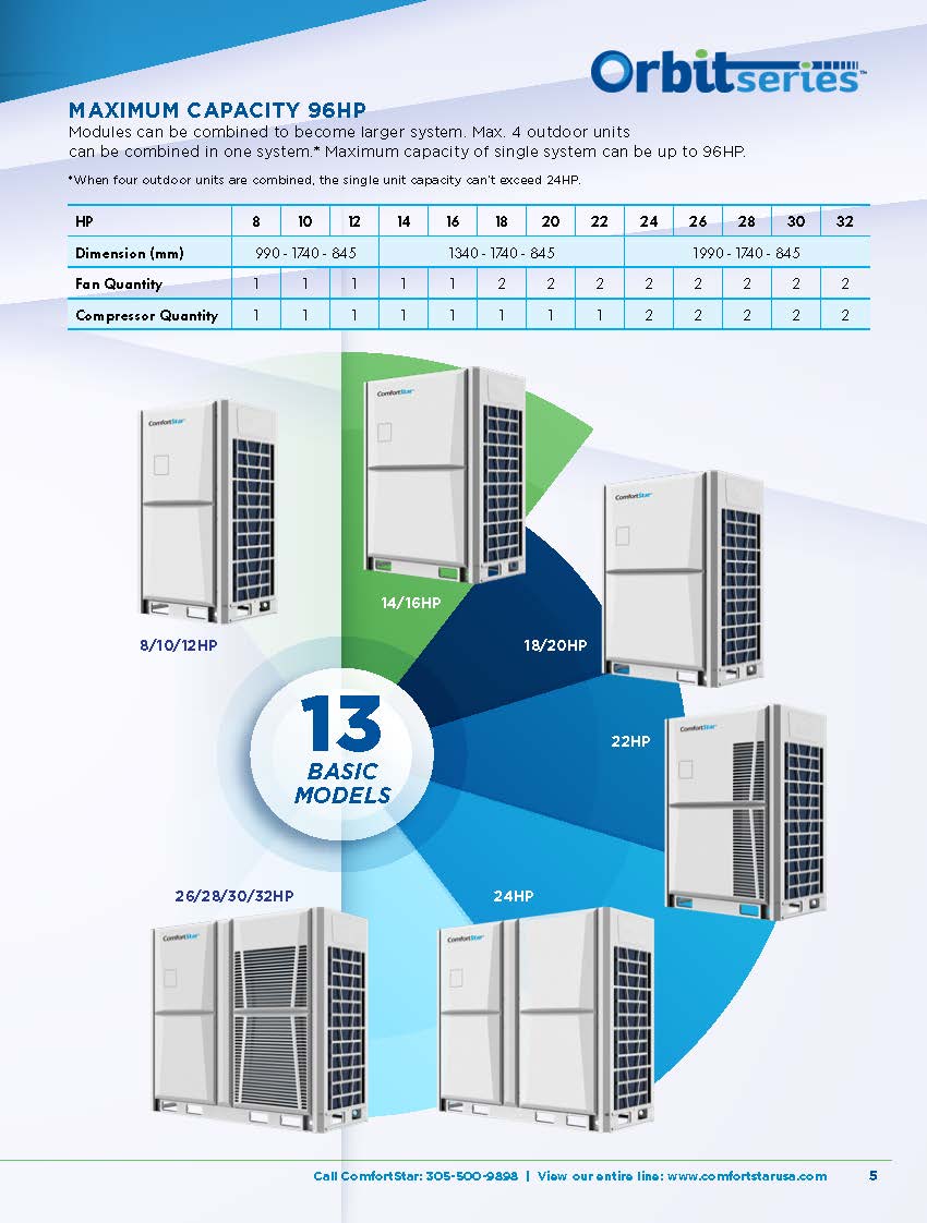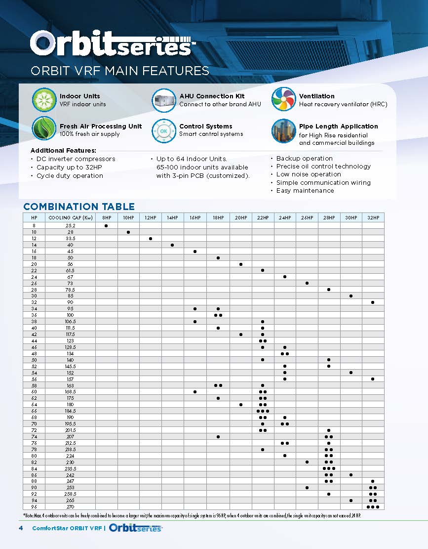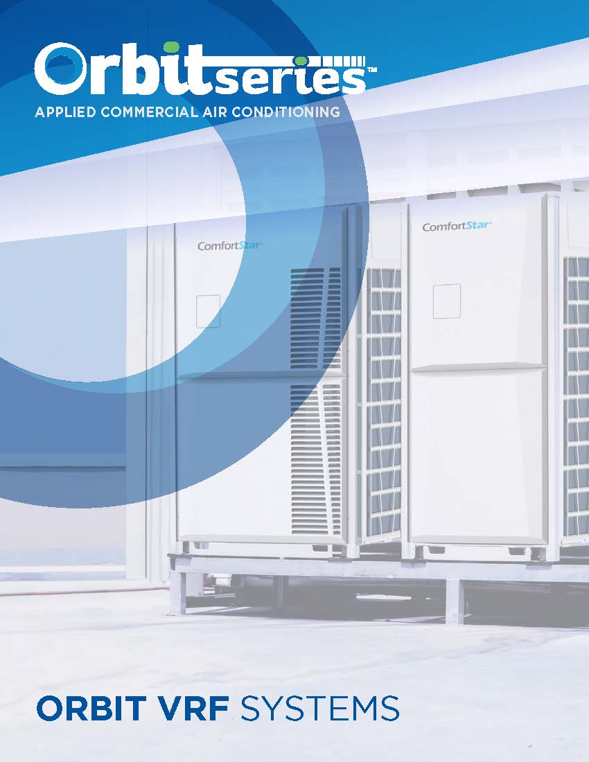 • COMFORTSTAR ORBIT VRF son unidades exteriores VRF de alto rendimiento. Con capacidades que van desde 8HP a 96HP en incrementos de 2HP, Orbit VRF ofrece alta eficiencia y refrigeración y calefacción excepcionales para todos los proyectos, grandes o pequeños.