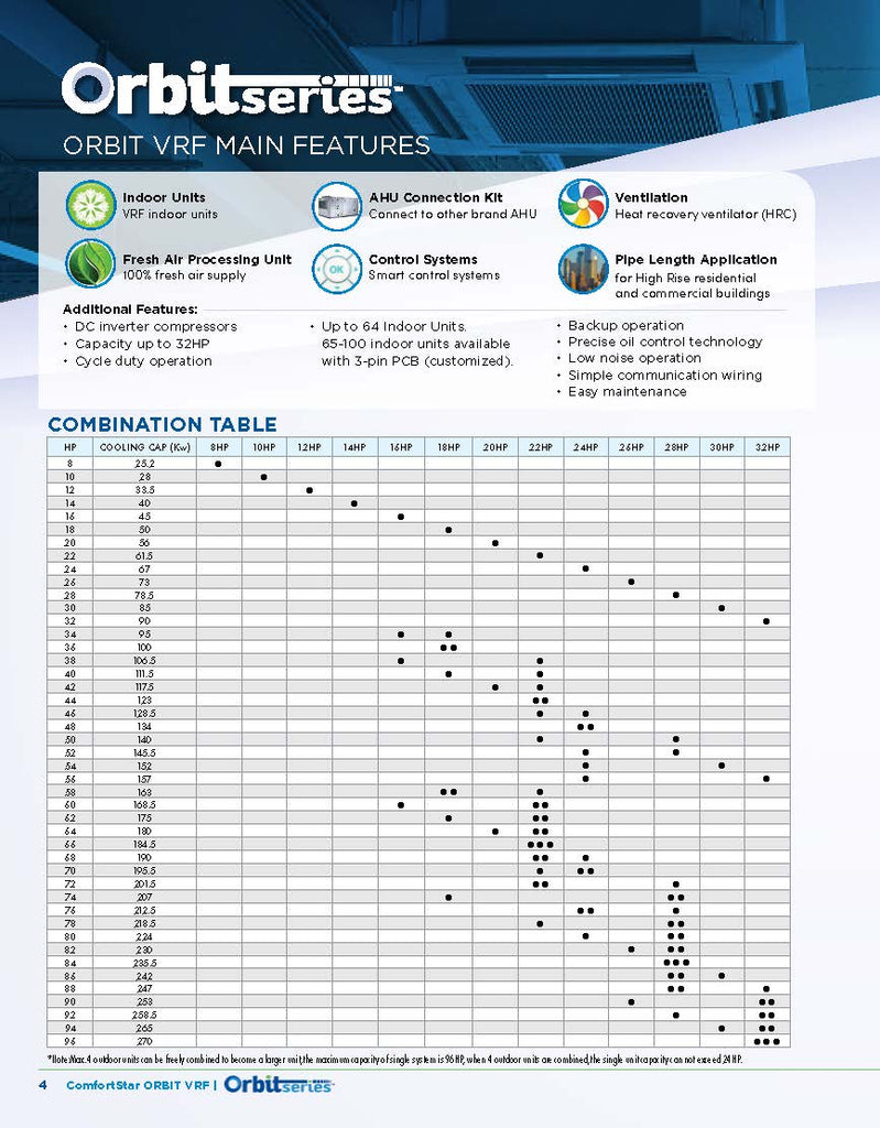• COMFORTSTAR ORBIT VRF son unidades exteriores VRF de alto rendimiento. Con capacidades que van desde 8HP a 96HP en incrementos de 2HP, Orbit VRF ofrece alta eficiencia y refrigeración y calefacción excepcionales para todos los proyectos, grandes o pequeños.
